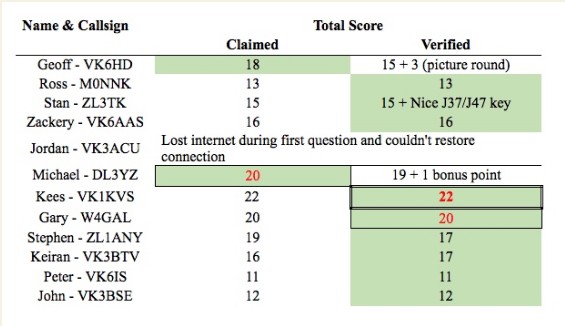 From Ron VK6KHZ who managed to mis-read the start time, and came in to the Zoom meeting after it’d finished; this is his email to Mike DL83YZ and Ross MONNK, both of whom were in the Quiz: + Hi Guys i have just finished talking to Mark only to be told that the quiz has finished I got the time wrong.