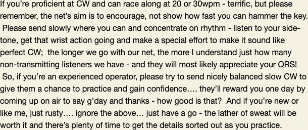 Nic VK7WW runs a Slow Morse training net every Wednesday at 7pm EDST on 3580 for 30 mins. He uses the callsign of the Northern Tasmania Amateur Radio Club VK7TAZ on that net.
