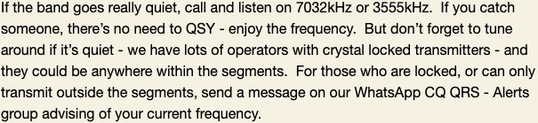 Hence the introduction of activities such as ‘Chinese Whispers’ and ‘Today in History’. These have been conducted at a remarkably consistent, considerate slow speed to conform with the CQ QRS Group paradigm, but have shown disappointing levels of participation.