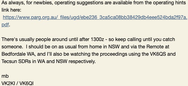 You guys in the southern hemisphere don’t seem to suffer from QSB – “This day in history” would be a nightmare with the frequent QSB we get up here + I could hear VK6KHZ near Perth (rather weak but readable) on a Sydney webSDR + That was a nice example of long range propogation using modest power, and would’ve made an enjoyable challenge for one of the more experienced east-coast operators