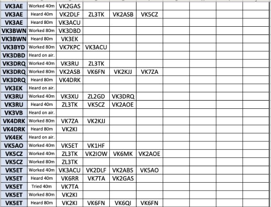 Thank you so much to our team of 37 contributors: G4RWI, MONNK, VK2AOE, VK2ASB, VK2DLF, VK2GAS, VK2KJJ, VK3ACU, VK3AE, VK3BWN, VK3BYD, VK3DRQ, VK3JFP, VK3RU, VK4DRK, VK4MFX, VK5AO, VK5CZ, VK5ET, VK5QA, VK3CLD, VK6BEK, VK6FN, VK6HRC, VK6IS, VK6JDM, VK6KHZ, VK6MK, VK6PZT, VK6RR, VK7KPC, VK7TA, VK7WW, VK7ZA, ZL1PB, ZL2GD, ZL3TK; your efforts are very much appreciated by me and our readers folks.
