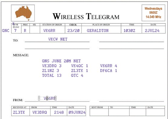 Patience and consideration are traits needed by traffic handlers, otherwise errors are possible… but are not acceptable. Here is the first message which was a relay of OM Roy’s VKCW Net summary for June.