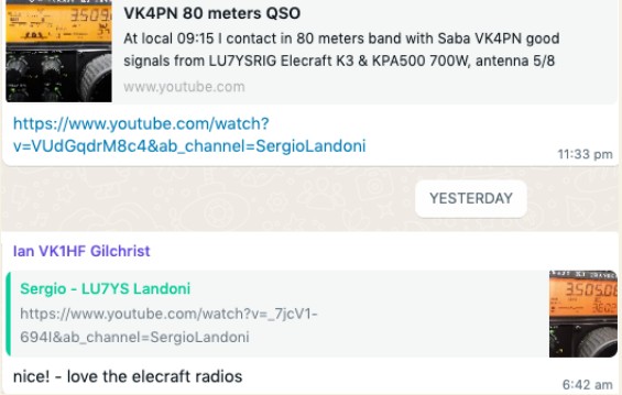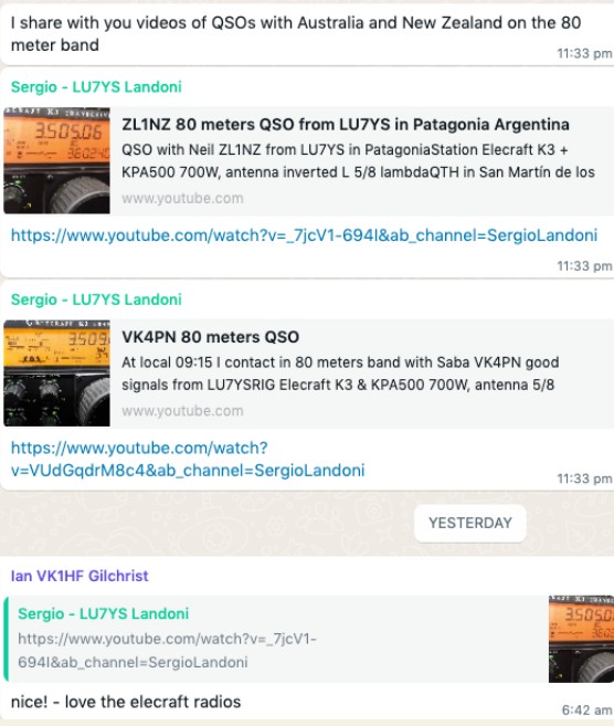 | share with you videos of QSOs with Australia and New Zealand on the 80 meter band: https:/Avww.youtube.com/watch?v= 7jcV1-694l&ab_ channel=SergioLandoni hitps:/Awww. youtube.com/watch?v=VUdGqdrM8c4&ab_channel=SergioLandoni