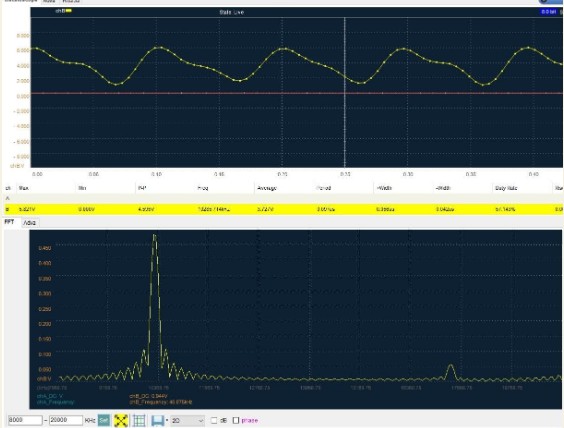 | only have a cheap 20 MHz USB oscilloscope so, with a signal of 10 MHz, it’s fairly close to its Nyquist Frequency, hence the data point dots along the waveform. The FFT display looks nice though.