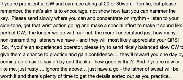 And Sava has been a CW enthusiast since he was licensed over 60 years ago, and is really pleased to see the resurgence that our net has produced. Welcome to the team guys and I look forward to getting reports from you each week about what you heard on the net.