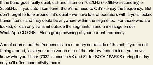 My experiments have shown that sometimes there is a RF window opening up on 20m from Germany to Australia, about the same time the QRS net is taking place on.