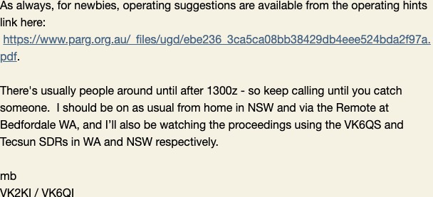 Max VK6FN called in but before he could report the jolly network failed at his end again! Hank KA3BMS dropped in to say hello and catch up with his Australian lessons ©) Christine VK6ZLZ called in to say good morning and give us a weather warning.