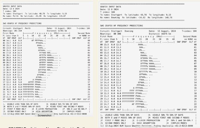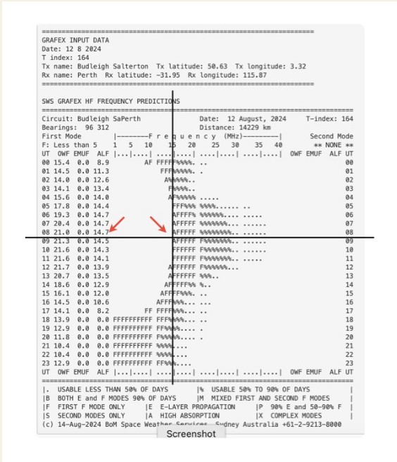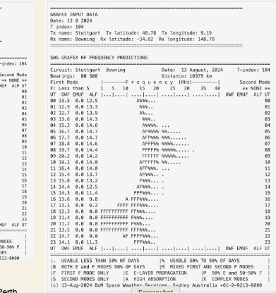 + I confirmed with the BOM the next day that the system only does the prediction for short-paths. + For future tests, I’ll need to try to find an ionospheric prediction suite (eg the VOA one) to see if long-path prediction was possible.