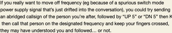 By the way, for anyone who would like to give this a try, I suggest: + don’t just send your callsign – there’s often multiple QSOs on frequency with stations not hearing others – and it’d be difficult to tell if you’re breaking in or just happen to be calling on the same frequency; and + don’t break in if one of the stations sends KN at the end of their transmission – that means that only the station in the QSO is invited to transmit.