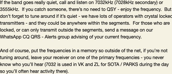 Getting reports from stations and listeners is important to me – even if you listened and didn’t hear anyone or weren’t able to copy anything – the fact that you had a go will then be recorded so we know that the net is working and attracting new and old team members to have a go.