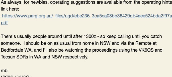 Fantastic! Thank you team. GU CW on Tuesday, mb Mark Bosma VK2KI / VK6QI Beautiful South Bowning NSW mark.bosma@icloud.com non impediti ratione cogitationis
