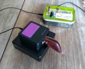 It’s just a heavy square black base with a smaller square black box on top and a couple of paddles sticking out. The purple patch on top is just a piece of coloured card covering up the manufacturer’s name ‘cuz I don’t want to look at that every day.