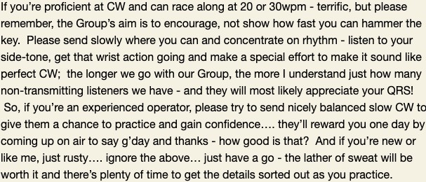 Thank you so much to our team of 31 contributors for this week’s RagChew: DL3YZ, MONNK, VK2ASB, VK2DLF, VK2GAS, VK2TIG, VK2WF, VK3ACU, VK3BTV, VKSBWN, VK3DRQ, VK3JFP, VKSKEV, VK5AO, VKSET, VKSKFG, VK5LA, VK6BEK, VK6GX, VK6HRC, VK6JDM, VK6MK, VK6NW, VK6PZT, VK6RR, VK6WE, VK7TA, VK7WW, ZL1PB, ZL38TK, ZL4BDG GU CW on Tuesday, mb Mark Bosma VK2KI / VK6QI Beautiful South Bowning NSW mark.bosma@icloud.com non impediti ratione cogitationis