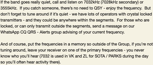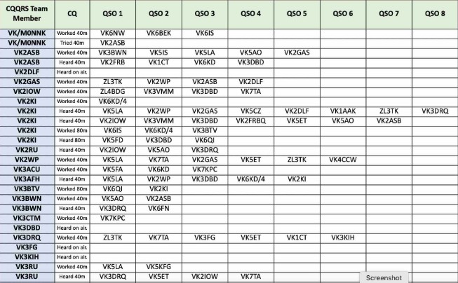 If we’re on 40m and you can hear that the band is open outside Australasia, perhaps consider calling 500HZ above each 1KHZ slot – to minimise the chance of having to copy our team through QRQ QRM that’s often dead-on the kHz markers.