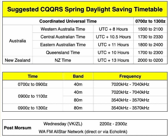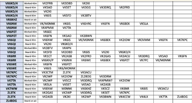And when you enter the list of callsigns worked, heard or missed, please append an ‘@band’ to each callsign without a space (eg VK2KI@20 VK6QI@15 etc). Please help attract new and old team members to have a go by submitting your report each week.