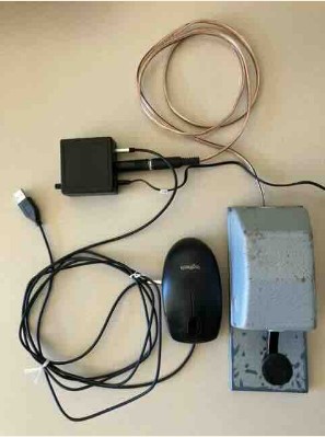The photo shows my setup: An old Junker key plugged into the Picokeyer – a lead from the Picokeyer going to the mouse, which is plugged into a USB port on the computer.