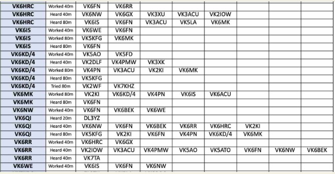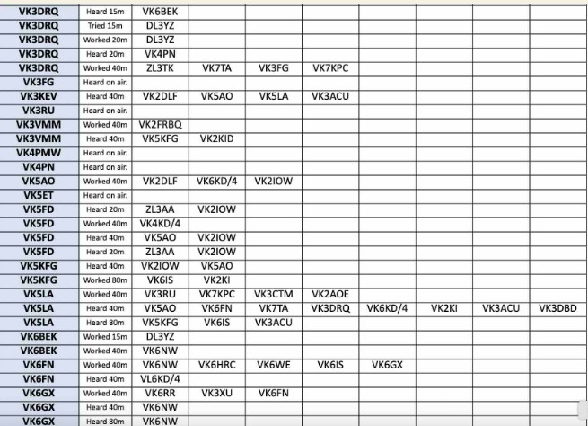 And when you enter the list of callsigns worked, heard or missed, please append an ‘@band’ to each callsign without a space (eg VK2KI@20 VK6QI@15 etc). Help attract new and old team members to have a go by submitting your report each week.