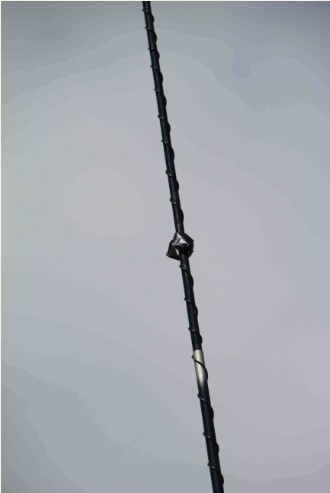 The loosely wound insulated conductor on the Squid-pole has been connected to the top of my 5′ HF antenna whip on the vehicle.