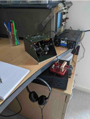 | also have an Icom 7300 for other operations (on the same desk just out of the picture). The antenna is a simple 40 m dipole fed with home made ladder line out of an SGC tuner.