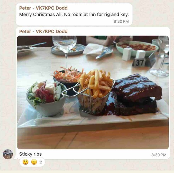 Hank got in early to pass on his Christmas greetings and went into listening mode. David checked in from Eastern Victoria and let us know he has purchased some toroids to try and sort the gremlins with his 80MX set up and is planning to be on for next Tuesday.