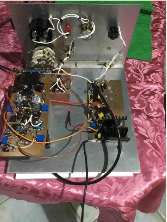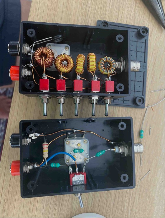 The amp works as of 1 hour ago and has a built in forward and reflected power meter. Only wired for 40 metres at the moment as we need more miniature coax to wire-in the band switch for the filters.
