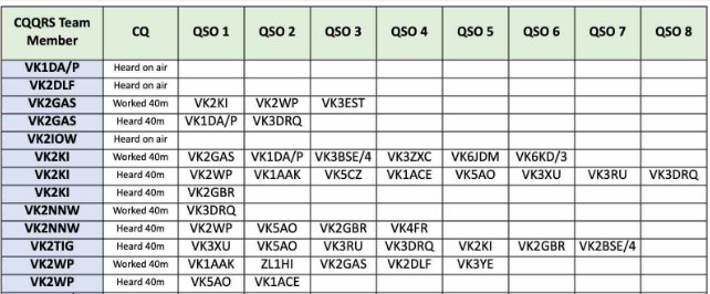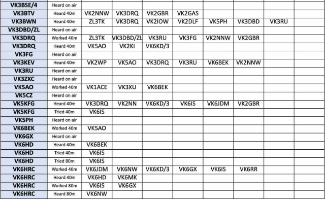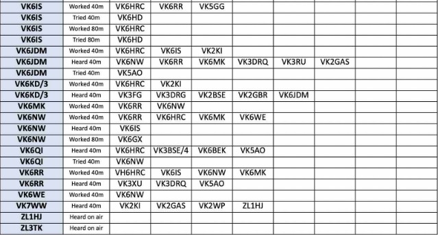 Thank you so much to our team of 27 contributors: G4RWI, MONNK, VK2GAS, VK2NNW, VK2TIG, VK2WP, VK3BTV, VK3BWN, VK3DBD, VK3DRQ, VK3JDM, VK3KEV, VK3RU, VK5AO, VK5KFG, VK6BEK, VK6HD, VK6HRC, VK6IS, VK6JDM, VK6KD/3, VK6MK, VK6NW, VK6RR, VK6WE, VK7WW and ZL3TK.