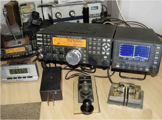 I can glance at the screen and see any signals over about 12 kHz of the band or much – more or less – my choice. You can also see my touch key (left), the USA flameproof and one of my home brew paddles.