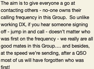 The aim is to give everyone a go at contacting others – no-one owns their calling frequency in this Group. So unlike working DX, if you hear someone signing off – jump in and call – doesn’t matter who was first on the frequency – we really are all good mates in this Group….