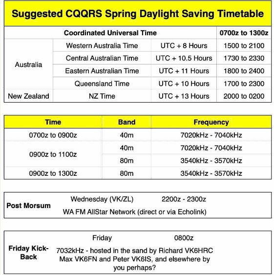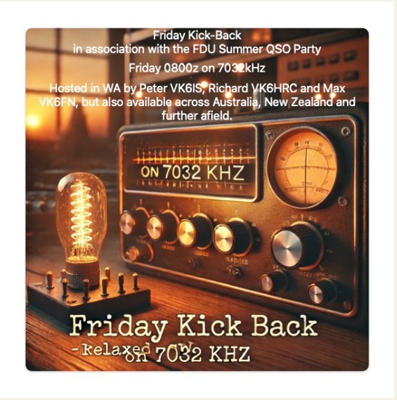 If you’re in WA and can’t connect, give Richard a call on 3605kKHz SSB from 0700 (23002). Friday Kick-Back And if you’re around on Friday arvo / evening, how about coming up on 7032KHZ at 0800Z and calling CQQRS?