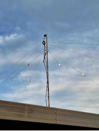 The masthead photograph last week was of the TET Emtron two-band dipole and Bushcom antennas of Wayne VK6NW at Bridgetown. Wayne has pointed out that what appeared to be one feedline to both antennas, was in fact two separate feeds.