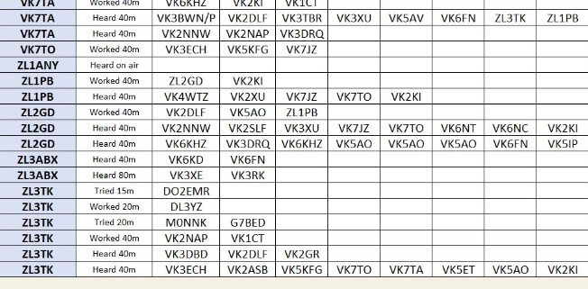 With thanks to Nigel G4RWI’s clever software, and John VK2RU’s clever spreadsheet work, here’s the 72 stations heard by 50 members of our team on Tuesday: