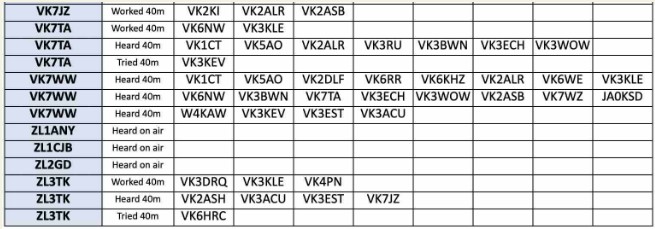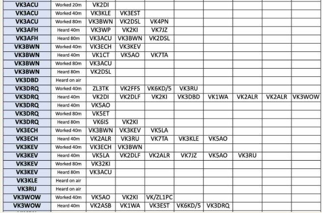 Once again, a huge thank-you to our part-time Aussie Nigel G4RWI for building bott the webform that we all use to submit our reports, and the outstanding software too that I use to convert the collected reports into the Excel spreadsheet above and individual reports that you’ll see below.