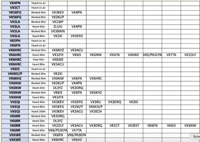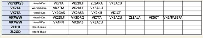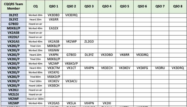 Thank you so much to our team of 29 contributors: DL3YZ, G7BED, MOKBJ/P, VK2GAS, VK2RU, VK2WP, VK3ACU, VK3BWN, VK3CLD, VK3CTM, VK3DRQ, VK3ECH, VK3JFR, VK3KEV, VK3RU, VK5KFG, VK5LA, VK6HRC, VK6JDM, VK6KD/P, VK6KHZ, VK6NW, VK6QI, VK6RR, VK6WE, VK7KPC, VK7TA, VK7WW and ZL3TK.