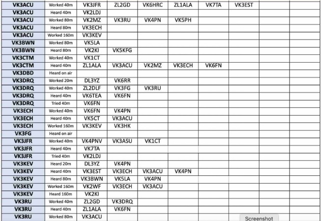 Mark also reported a push by several of the VK3S to have QSOs on 160M – but he couldn’t make himself heard on that band. So all in all – another good night was reported by all.