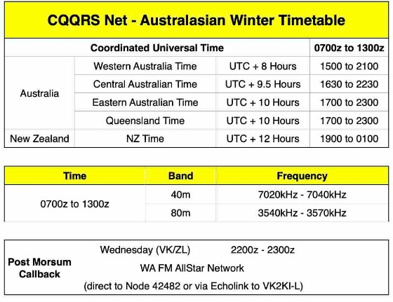 For the current schedule and more information about the CQQRS net, please go the the Net Details page on our website: