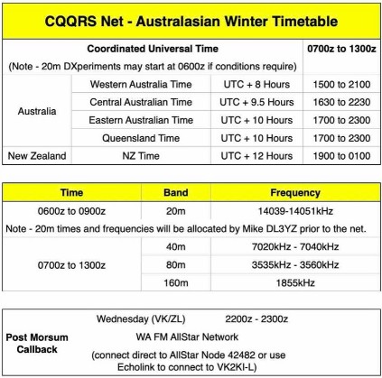 For the current schedule and more information about the CQQRS net, please go the the Net Details page on our website: