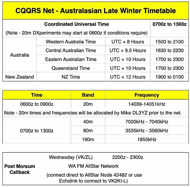For the current schedule and more information about the CQQRS net, please go the the Net Details page on our website: