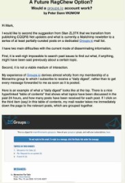 In last week’s RagChew, Peter VK3WOW supported previous suggestions from others about the use of the groups.io system – allowing individual members to post material without needing any editorial input, and using weekly summaries instead of aweekly newsletter.
