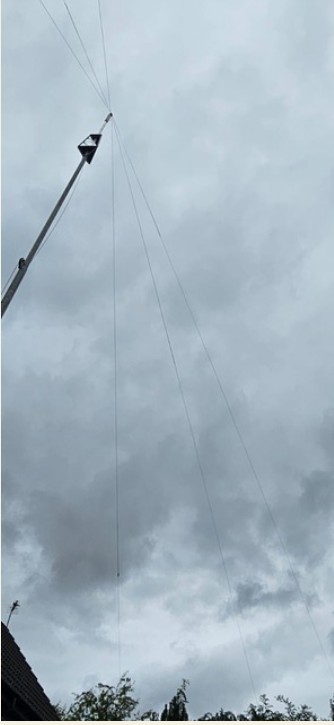 Quick description as follows … – 3 dipoles for 10m, 20m and 40m – All running from the same (common) feeder cable – Took some tweaking (mast up/down) because as you tune one, the others wander off – But eventually you get an antenna system that (using the built-in tuner in the radio) is useable on 10/20/40 AND ALL the WARC bands too.