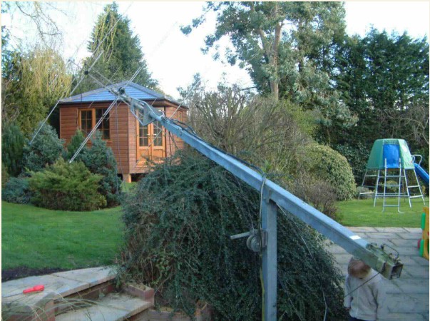 I still have half of a similar antenna tangled up with the corrugated roofing iron tek-screws after a storm; with parallel elements (not fanned), I could never get the antenna to work properly so when the rope deteriorated and it blew down, it stayed where it landed!