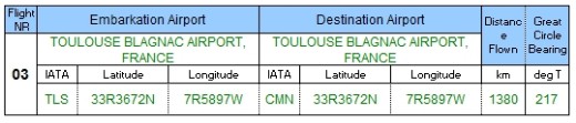 Look first at the two IATA codes, then see how the airport of embarkation and its coordinates are the same as those of the destination airport? How can that be possible? Now consider the distance travelled, it shows they’re not exactly located inthe same city.