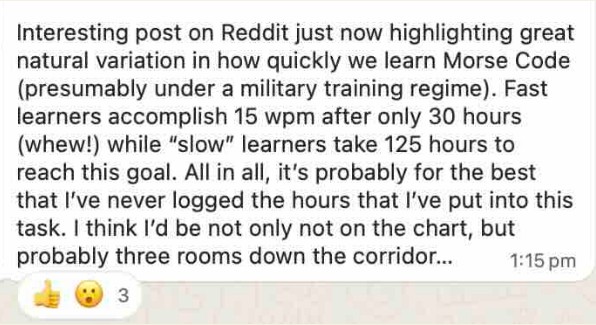 The folks who’d love to have CW contacts with you certainly don’t! The other side of the coin is if you’re struggling – that’s normal. I struggled and hated it when I had to learr the Code in the 70s for the AOCP exam….