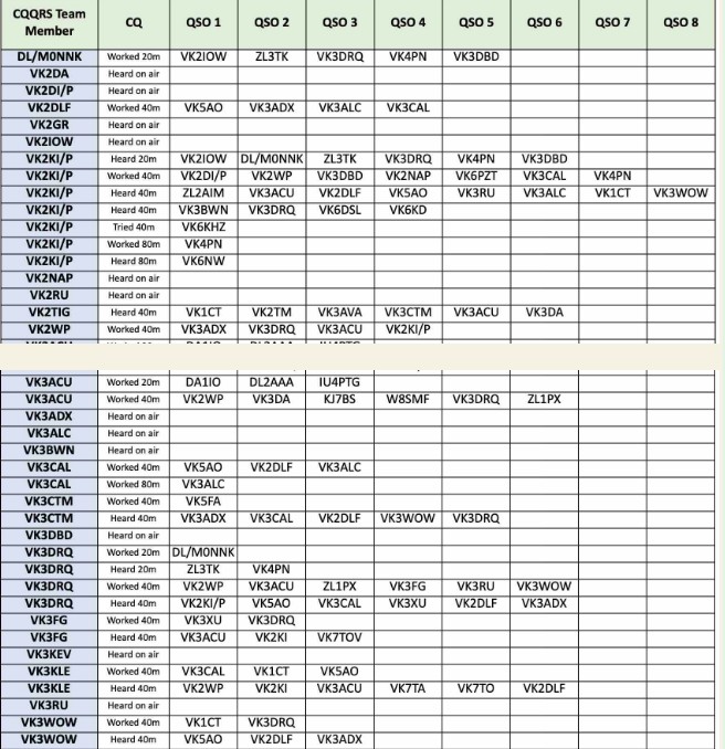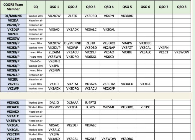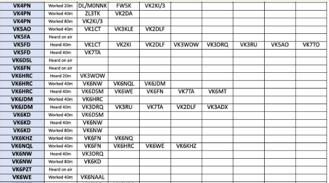 Thank you so much to our team of 31 contributors: DL/MONNK, VK2DLF, VK2IOW, VK2RU, VK2TIG, VK2VIC, VK2WP, VKSACU, VK3CAL, VK3CTM, VK3DBD, VK3DRQ VK3FG, VK8KLE, VK3QB, VK3WOW, VK4PN, VK5AO, VKSFD, VK6HRC, VK6UDM, VK6KD, VK6KHZ, VK6NQL, VK6NW, VK6WE, VK7HH, VK7ME, VK7TA, VK7TO and ZL8TK.