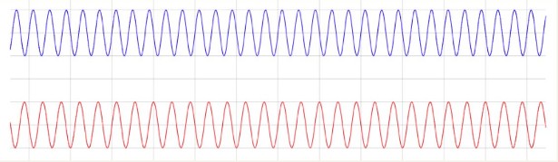 To improve clarity, let’s overlay them. They’re not mixed yet, just displayed together. OA ACMA AU It should now be obvious that they’re not the same frequency, and as such, at times the waveforms are perfectly in phase, and at other times, they’re out of phase by 180 deg.