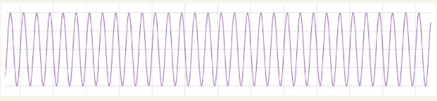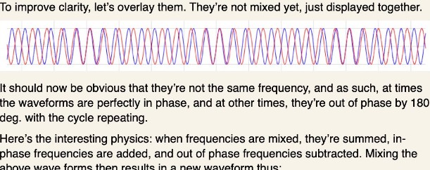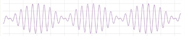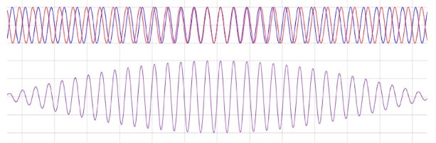 With the cycle repeating. Here’s the interesting physics: when frequencies are mixed, they’re summed, in- phase frequencies are added, and out of phase frequencies subtracted. Mixing the above wave forms then results in a new waveform thus: