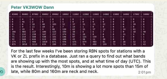 • rom Richard VK6HRC at Padbury 40m] A good session with lots of traffic to practice decoding, thanks to all. 80m] Called on 80m for a while later on, no contacts infortunately.