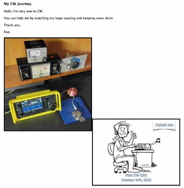 Welcome this week to Peter VK3PWG from Ballarat; we now have four CQQRS team members in that town. I look forward to hearing from you about your CW journey Peter, and hoping that we can help add to the fun.
