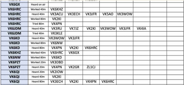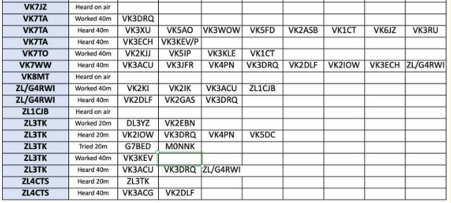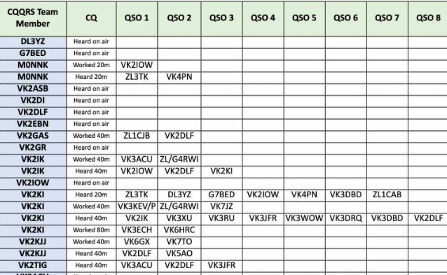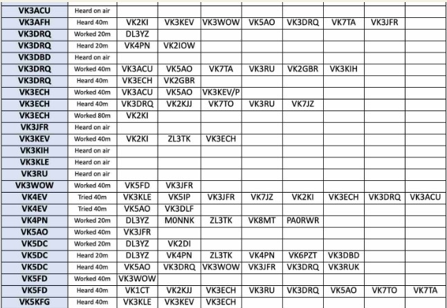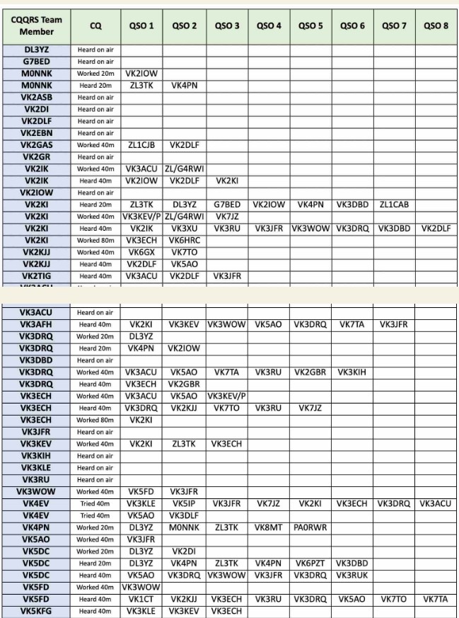 Thank you so much to our team of 33 contributors: DL8YZ, MONNK, SWL Jack, VK2GAS, VK2IK, VK2IOW, VK2KJJ, VK2RU, VK2TIG, VK8AFH, VK3DRQ, VK3ECH, VK8KEV, VK3WOW, VK4EV, VK4PN, VK5AO, VKSDC, VKSFD, VK5KFG, VK6HRC, VK6JDM, VK6KD, VK6KHZ, VK6NW, VK6PZT, VK7TA, VK7TO, VK7WW, VK8MT, ZU/G4RWI, ZL3TK, ZLACTS.