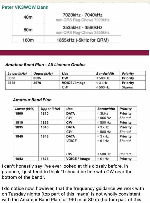 [Well spotted Peter. I’m happy to change our 160M calling frequency, but will live with our 80m slot. My thinking about 80m is that there will occasionally be 80m SSB listeners who venture down into our sand pit, intending to listen to phone.