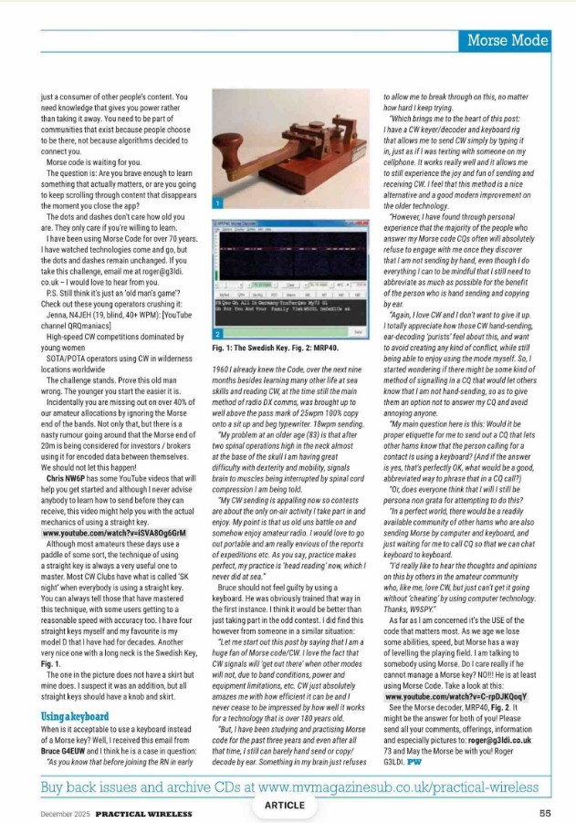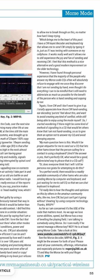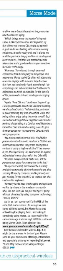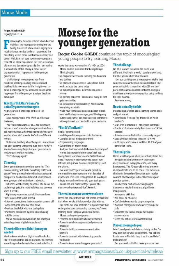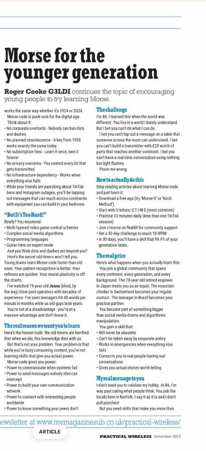 From Geoff VK6HD Hi Mark Just sitting reading Dec issue of (UK) Practical Wireless and found this article which actually makes a good argument for young people to learn CW. Thought you might like it for RagChew. Ciao G